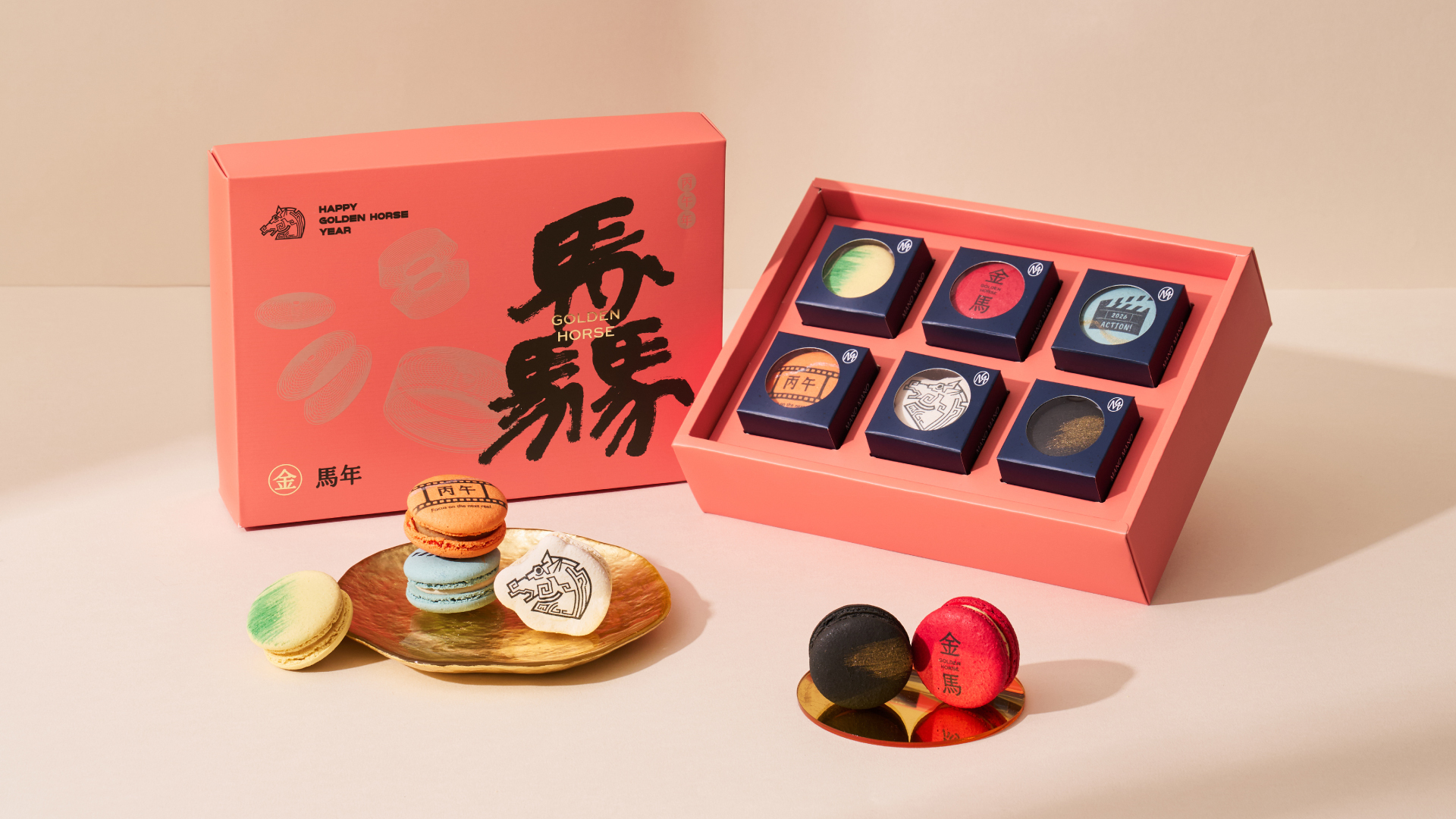 以馬卡龍精緻且繽紛的層次,祝願您在新的一年「馬到成功、步步高升」,並將場記板、電影膠捲與標誌性的金馬幻化為精品甜點,寓意新歲如影燦爛,送出的不只是甜點,更是用甜蜜祝福解鎖 2026 的幸福密碼!
