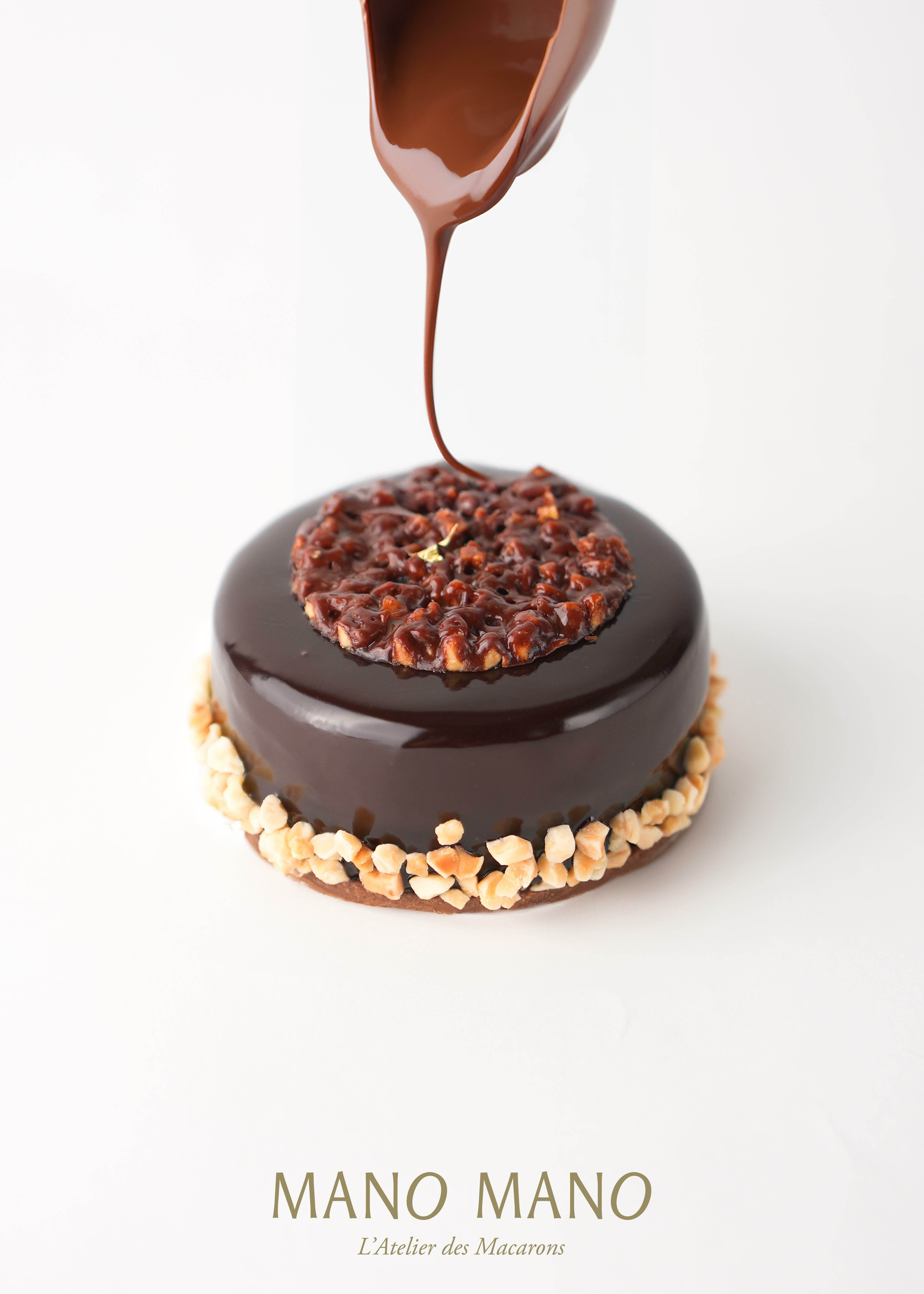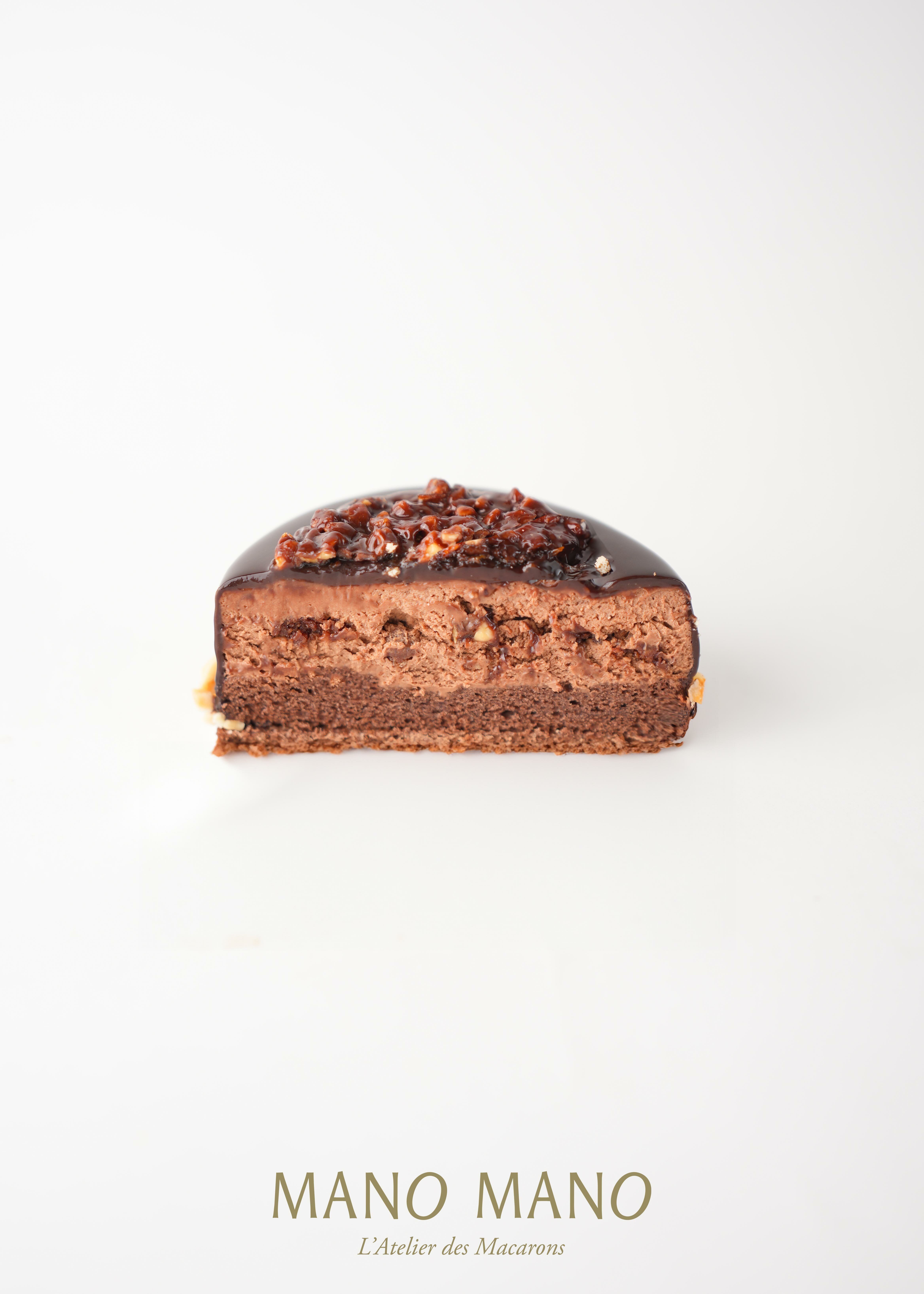 可可焦糖脆片的輕盈酥脆與杏仁蛋糕的柔軟質地相得益彰,巧妙融合了多重風味與口感。